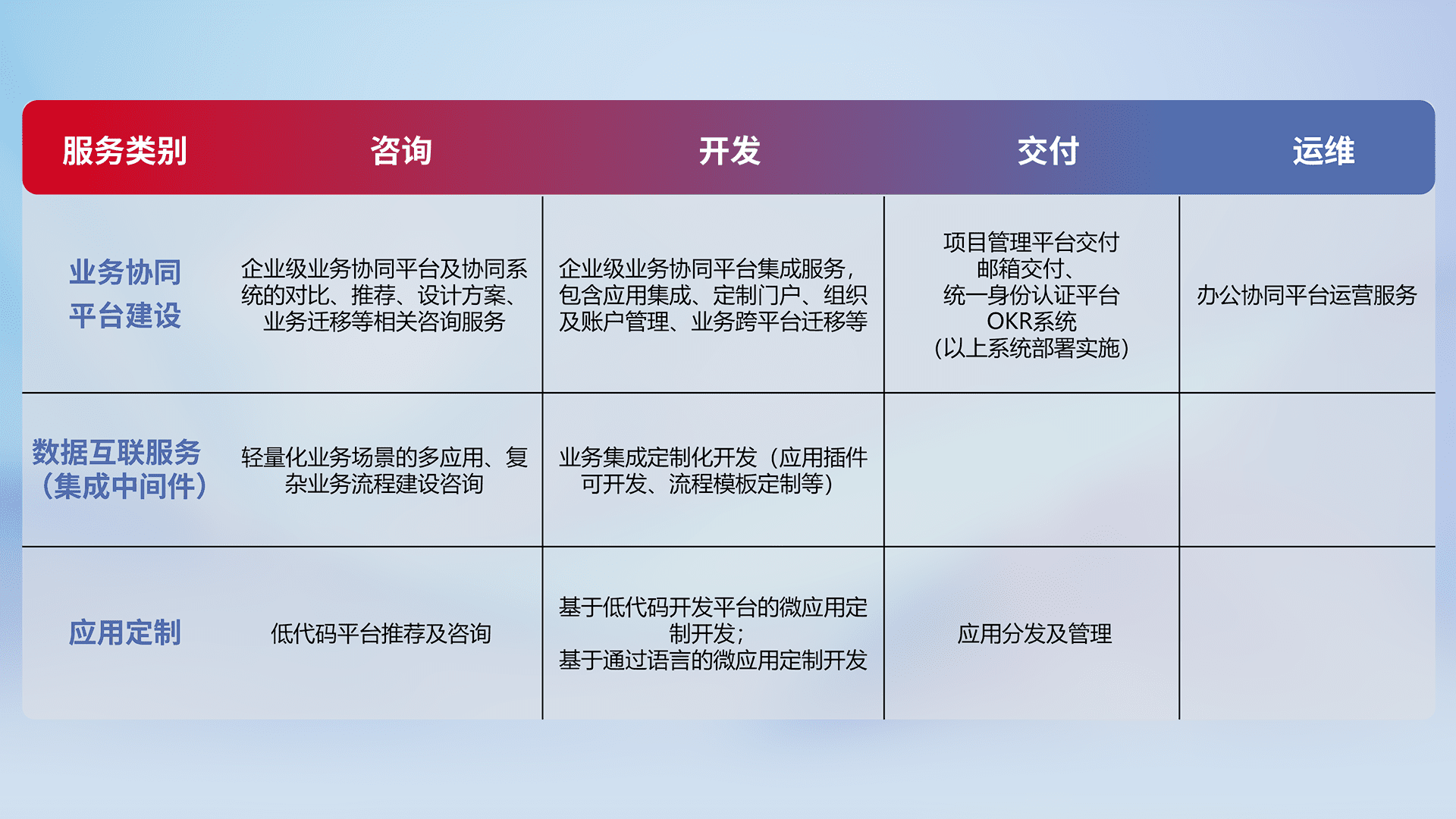 针对钉钉、、、、企微、、IDaas等平台级产品提供产品的规划、、方案、、、、交付、、、、定制化开发等服务,,,实现如统一协同办公、、、智能客户服务、、混合会议管理、、、、智能数据查询、、、、等业务场景,,实现数字化转型。。。